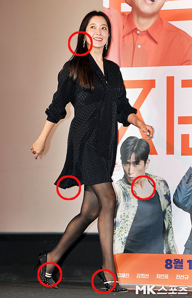 시사회에 앞서 포토타임을 갖는 김희선의 사진에서 다른 부분 5군데를 찾아보세요.