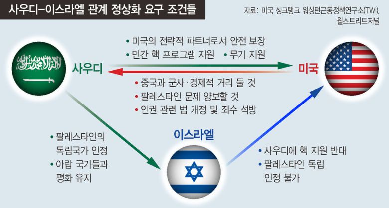 아랍에미리트(UAE)·바레인 등이 2020년 9월 이스라엘과 국교를 정상화한 ‘아브라함 협정’에 서명하긴 했지만, 사우디마저 이와 비슷한 방식으로 관계를 정상화하면 그 여파는 매우 클 수밖에 없다. 사우디는 팔레스타인이 ‘2국가 정책’에 따라 독립하면, 이스라엘이 이를 인정해야 한다고 요구해 왔다. 사우디는 그 밖에도 미국이 민간 핵 프로그램을 지원하고, 직접 안전보장을 해줄 것을 요구하고 있다. 이스라엘은 사우디가 핵 프로그램을 갖게 되면 핵 개발로 이어질 수 있다며 반대하는 중이다.