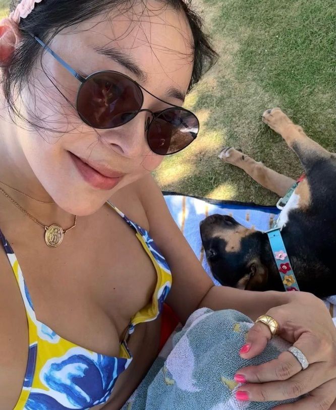 공개된 사진 속 이혜영은 과감한 절개선의 비키니를 입고 반려견과 함께 포즈를 취하고 있다. 살짝 드러난 글래머 몸매가 눈길을 끈다.