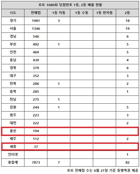 동행복권이 12일 추첨한 로또 1080회 당첨번호 조회 결과 1등은 7명, 2등은 82게임이다. 전국 17개 시도 중 울산, 세종 지역에서는 로또 고액(1,2등) 당첨 판매점이 단 한 곳도 나오지 않았다. |