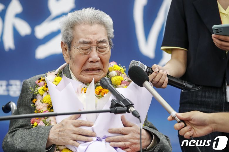 (서울=뉴스1) 김도우 기자 = 마지막 재일독립유공자 오성규 애국지사가 13일 서울 강서구 김포공항에서 열린 환국 환영 행사에서 언론사와 인터뷰를 하고 있다. 오 지사는 일제강점기 중국 만주 봉천 소재 동광중학을 중심으로 항일운동을 했고, 일제에 조직망이 노출되자 만주를 탈출해 중국 안후이성의 한국광복군 제3지대에 입대해 독립운동을 펼쳤다. 2023.8.13/뉴스1
