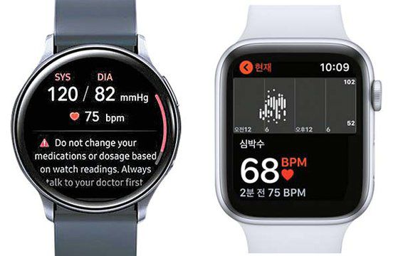 삼성전자의 갤럭시워치 액티브2(왼쪽)와 애플의 애플워치5. 미래의 헬스케어 시장을 선점하겠다는 판단에 거대 IT 업체들의 스마트워치 경쟁도 격화하고 있다. [사진 각 회사] |