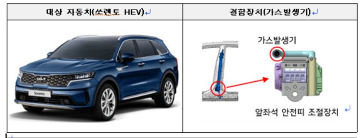 17일 국토교통부에 따르면 기아 쏘렌토 HEV 8만1608대는 앞좌석 안전띠 조절장치의 내부 부품 불량으로, 쏘렌토 등 2개 차종 2만8858대는 방향지시등 레버 제조 불량으로 각각 시정조치에 들어간다.