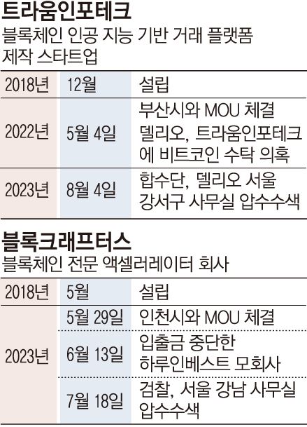블록체인 허브를 표방하는 부산·인천광역시가 입출금을 중단한 가상자산 예치 서비스 ‘하루인베스트·델리오’ 관계사와 업무협약(MOU)을 체결한 것으로 확인됐다. 두 회사 모두 검찰 수사를 받으며 사실상 폐업 수순을 밟고 있어 지자체와 협력 사업도 멈췄다.