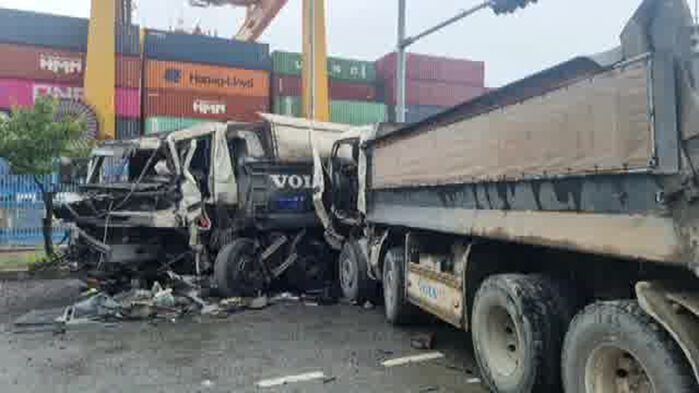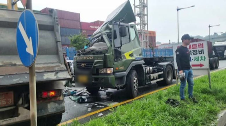부산강서경찰서에 따르면, 오늘(19일) 오전 11시 10분쯤 강서구 성북동 부산신항 앞 교차로에서 25t 덤프트럭 2대, 대형 화물트럭 1대, 1톤 포터 1대, 승용차 1대 등 차량 5대가 잇따라 부딪치는 사고가 일어났습니다.