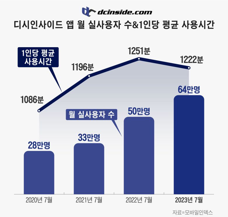단순히 일회성 웹 접속이 아닌 앱 설치를 통한 방문자가 증가했다는 건 디시인사이드를 주기적으로 사용하는 하드 유저가 늘었다는 의미다. 지난달 디시인사이드의 1인당 평균 사용시간은 1222분으로 3년 전 1086분과 비교해 136분 증가했다.