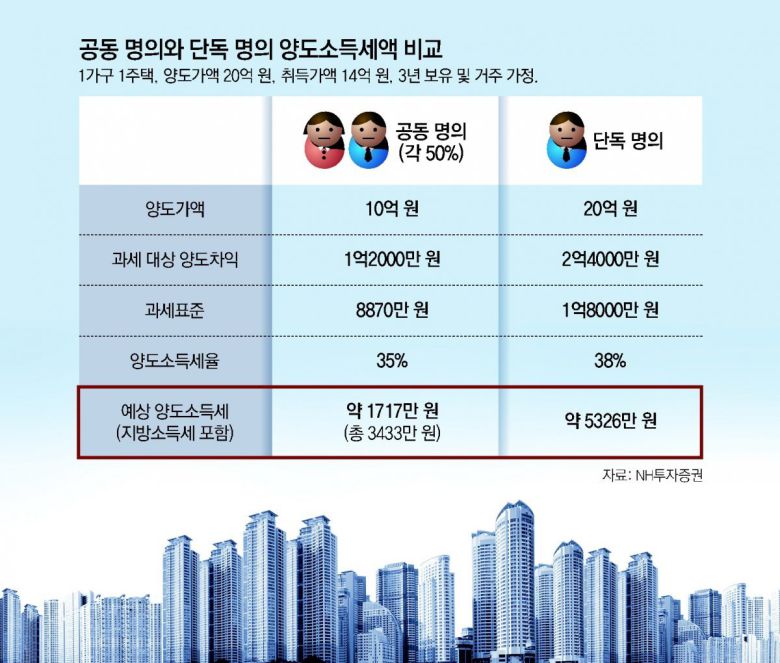 양도소득세는 개인별로, 과세표준 구간별 소득세 누진세율 구조로 과세된다. 따라서 주택에 대한 양도차익을 두 명으로 나누면 과세표준 구간이 낮아지고 250만 원 기본공제도 두 번 차감할 수 있어 부담이 줄어든다. 표의 사례를 보면 양도차익 6억 원에 대해 공동 명의인 경우 단독 명의보다 양도세가 1893만 원 절감된다.