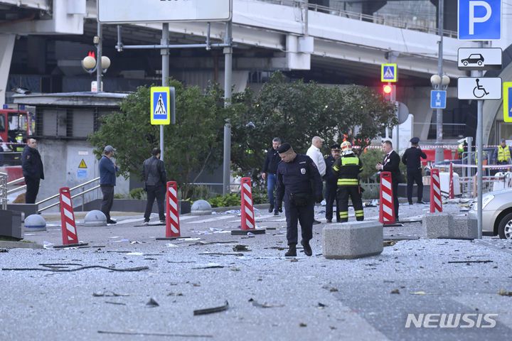 [모스크바=AP/뉴시스] 러시아 수도 모스크바 소재 주요 공항이 우크라이나의 무인기(드론) 공격으로 임시 폐쇄됐다가 운항 재개 절차에 나섰다고 22일(현지시간) 타스통신 등 외신이 보도했다. 사진은 모스크바에서 지난달 30일 우크라이나 드론 공격으로 파손된 상업지구의 한 건물 앞에서 러시아 수사관이 현장 조사를 벌이는 모습. 2023.08.22. |