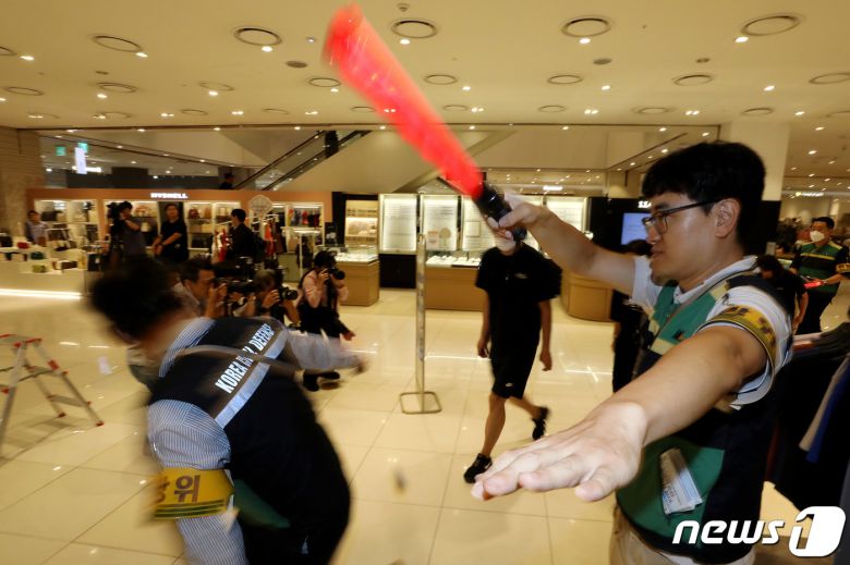 전국 단위 민방위 훈련이 실시된 23일 오후 서울 중구의 한 대형복합쇼핑몰에서 관계자들이 대피 훈련을 하고 있다. 이번 훈련은 6년 만에 실시되는 전국 동시 공습 대비 민방위 훈련으로 공습경보(15분), 경계경보(5분), 경보해제 순으로 진행됐다. 2023.8.23/뉴스1 ⓒ News1 이동해 기자 |