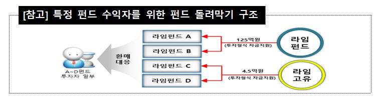 우선 라임자산운용은 2019년 8~9월 중 4개 라임 펀드에서 투자자산 부실, 유동성 부족 등으로 환매 대응 자금이 부족해지자 다른 펀드 자금 125억원과 운용사 고유자금 4억5000만원을 이용해 일부 투자자들에게 특혜성 환매를 실행했다. 대규모 환매 중단을 선언하기 불과 한 달 전 특정 펀드 수익자를 위한 펀드 돌려막기를 저지르며 펀드 투자자의 손실을 다른 펀드 투자자에게 떠넘긴 것이다. 다선(多選) 국회의원에게 2억원을 환매해주기도 했다.