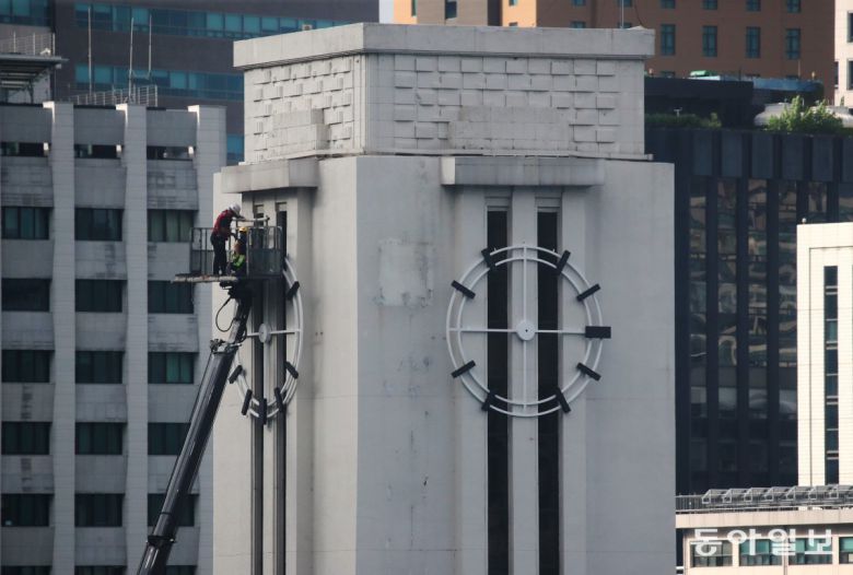24일 오전부터 서울시의회 앞 세종대로에는 대형 크레인 차가 한 차선을 막고 작업이 분주했다. 50년 전 모습 그대로의 시계를 다시 탑에 설치 하는 작업 때문이다.