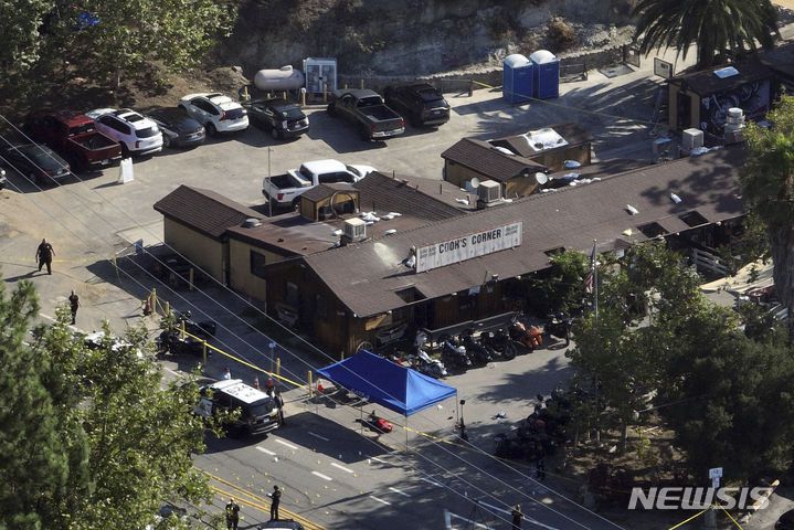[트라부커 캐니언=AP/뉴시스] 24일(현지시각) 미 캘리포니아주 오렌지카운티의 트라부코 캐니언에 있는 '쿡스 코너'에서 총격이 발생해 현장이 통제되고 있다. 경찰은 은퇴한 경관이 아내와 다투다 총격이 발생, 3명이 숨지고 6명이 다쳤다고 밝혔으며 총격범은 사살됐다. 2023.08.25.