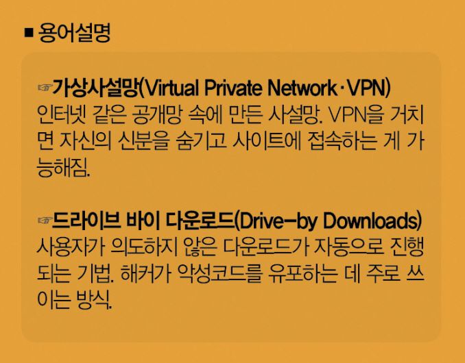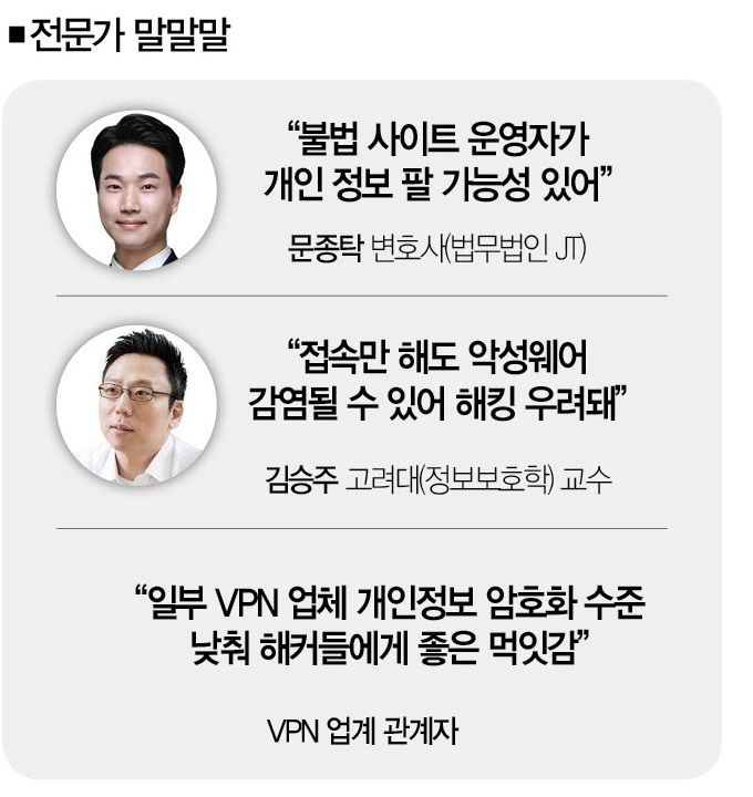 ■ 유출 경로➌ VPN =그럼 VPN은 어떨까요? VPN이 이용자의 정보를 감춰주니 이를 써서 불법 사이트에 접속해도 괜찮은 걸까요? 결론부터 말하면 그렇진 않습니다. VPN을 쓰고도 개인정보가 유출된 사례는 숱합니다.