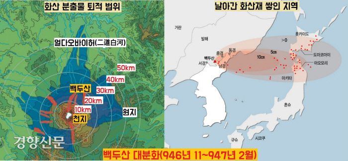 화산학자들이 현지조사를 통해 확인한 10세기 중엽의 백두산 대분화. 10세기 초반부터 소·중규모의 분화를 거쳐 946년11~947년 2월 사이에 기원후 2000년동안 가장 규모가 큰 ‘화산지수 7’의 대분화가 일어났다. 분출한 화산재는 대기 위로 25㎞ 이상 치솟아 겨울철 편서풍과 제트기류를 타고 함경도~동해안을 거쳐 일본열도까지 영향을 끼쳤다.|윤성효·이정현의 논문, 소원주의 단행본에서 정리 |