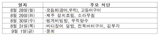 식단표도 함께 공개했다. 모듬회(광어·우럭), 고등어구이, 제주 갈치조림, 멍게 비빔밥, 바다장어 덮밥, 물회 등이 용산 대통령실과 대통령 경호처 구내식당에서 전 직원 및 출입 기자들에게 제공된다.