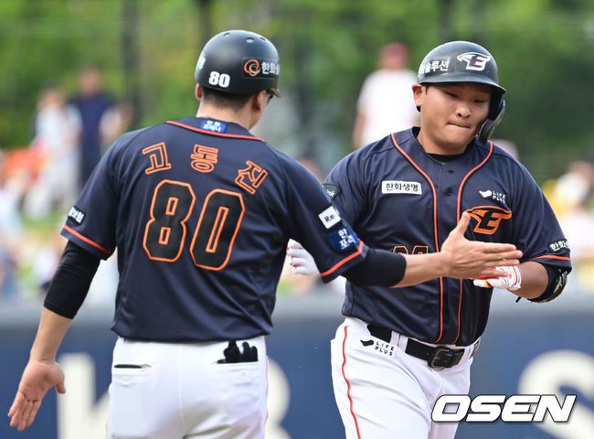1회초 1사 한화 김태연이 선취 솔로 홈런을 날린 뒤 고동진 코치와 하이파이브를 하고 있다. 2023.08.27 / ksl0919@osen.co.kr