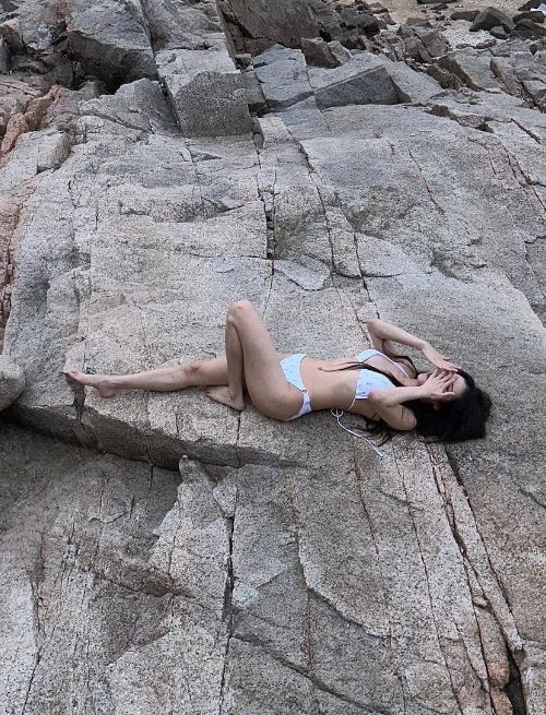 주이는 바위 위에 누워 얼굴을 가린 채 섹시한 몸매를 자랑하고 있다.