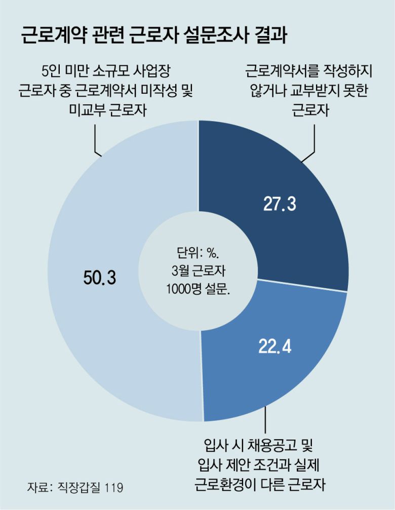 직장갑질119가 3월 근로자 1000명을 대상으로 한 설문조사에서 응답자의 27.3%가 근로계약서를 작성하지 않거나 받지 못했다고 답했다. 특히 ‘근로계약서를 작성하지도 않았다’고 응답한 비율은 14.3%에 달했으며, 5인 미만의 소규모 사업장은 절반 이상(50.3%)이 근로계약서 작성 및 교부 의무를 다하지 않은 것으로 조사됐다.