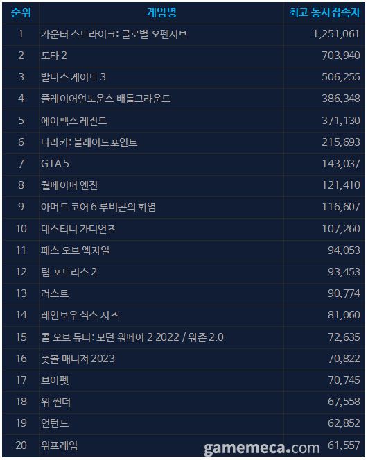 ▲ 8월 30일 오후 2시 기준 일 최고 동시접속자 TOP20 (자료출처: 스팀) |