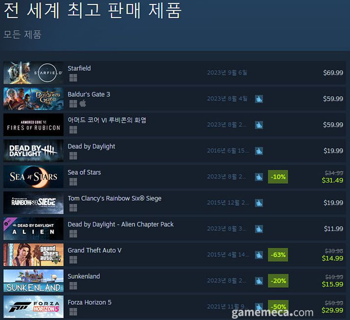씨 오브 스타즈 외에는 데드 바이 데이라이트가 에이리언 DLC를 정식 출시하며 게임 본편은 4위, DLC는 7위를 기록했다.
