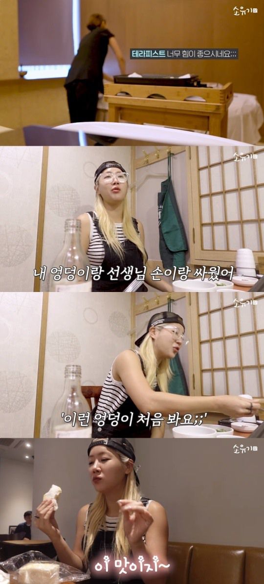 소유는 매니저들과 함께 장어를 먹으러 갔다. 소유는 "소주가 너무 달다"라며 "근래 받아봤던 마사지 중 가장 좋았다"고 재차 말했다. 소유는 "마사지를 할 때 내 엉덩이와 (마사지) 쌤이 싸웠다. 너무 아프니 힘이 들어가더라. 선생님이 이런 엉덩이는 처음 봤다고 해서 빵 터졌다"고 밝혔다.