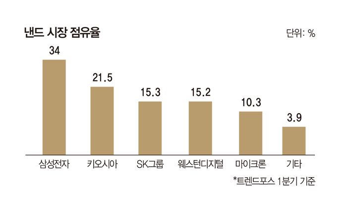 이 같은 기술 경쟁 추이에 따라 시장 점유율은 또다시 요동칠 것으로 전망된다. 시장조사업체 트렌드포스에 따르면 올 1분기 낸드 시장 점유율은 삼성전자 34%, 키오시아 21.5%, SK그룹(SK하이닉스+솔리다임) 15.3%, 웨스턴디지털(WD) 15.2%, 마이크론 10.3% 등이다. 키오시아와 WD를 합치면 점유율 36.7%로 삼성전자를 제치고 새로운 1위가 될 수 있다. 최근 블룸버그는 키오시아와 WD가 이달 말까지 합병 계약을 맺는 걸 목표로 한다고 보도했다. 여기에 양쯔메모리테크놀로지(YMTC)를 필두로 한 중국 기업들의 추격도 만만찮다. 5년의 기술격차를 둔 D램과 달리 낸드의 경우 한국과의 격차는 2년에 불과하다. 지난해 말 YMTC는 계획했던 192단 낸드 양산을 중단하고 곧바로 232단 낸드 양산으로 계획을 수정했다. SK하이닉스와 삼성전자는 공격적 감산과 더불어 부가가치가 높은 고사양 제품 개발에 집중하면서 불황 속 후발주자들의 추격을 물리친다는 계획이다. SK하이닉스는 “생성형 AI 등에 필요한 고성능·고용량 메모리 수요 확대에 맞춰 300단대 낸드 제품 수요도 빠르게 늘어날 것으로 예상된다”고 밝혔다.