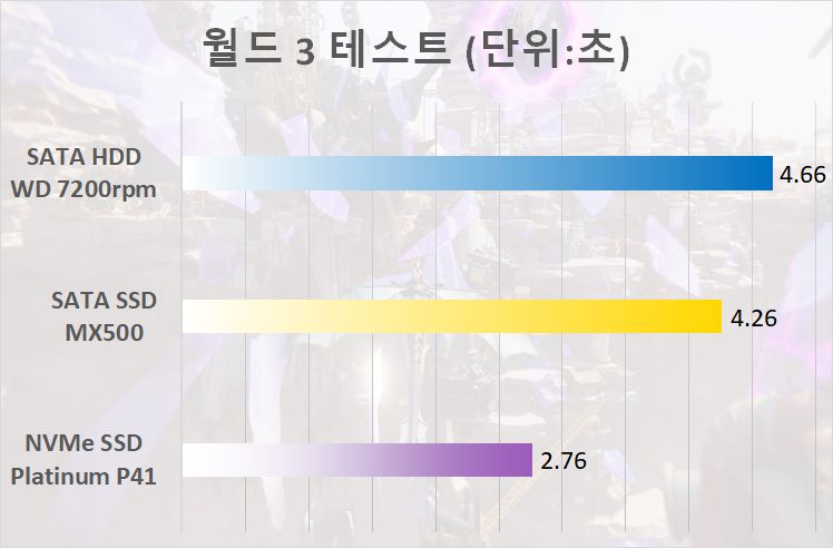 테스트 비교를 위한 저장장치는 WD 7200rpm HDD, 마이크론 MX500(SATA SSD), SK하이닉스 Platinum P41 M.2 NVMe(PCIe 4.0 NVMe SSD) 등 3가지다. 용량은 모두 1TB이고, 보다 정확한 비교를 위해 각 저장장치에 OS를 설치해서 직접 부팅 후 게임을 설치해서 구동했다.