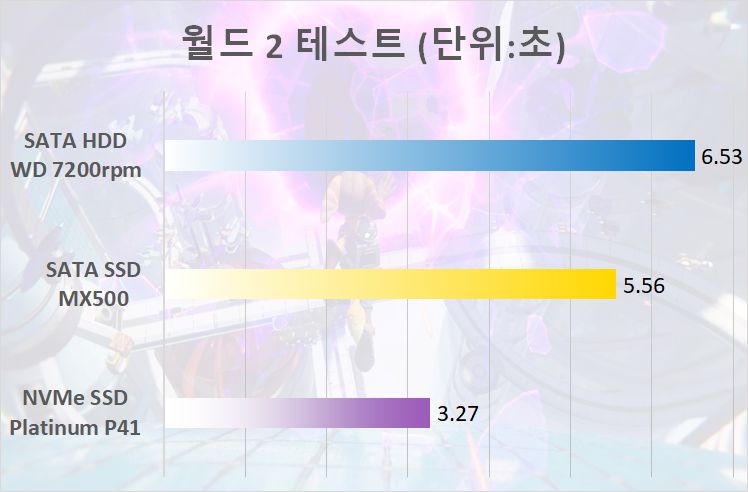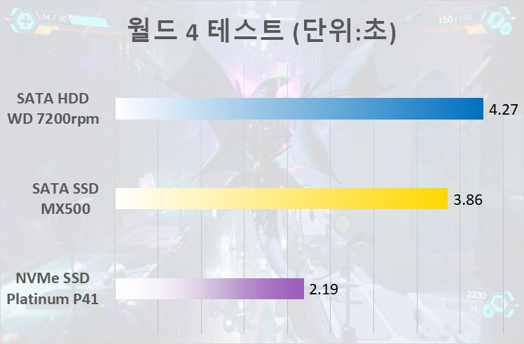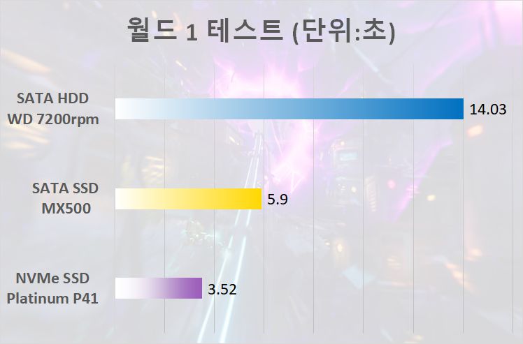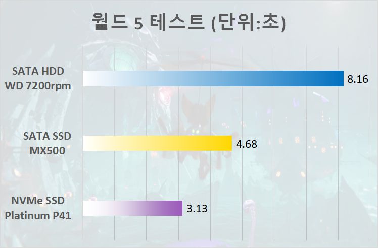 스테이지가 완전히 바뀌는 월드 1을 로딩할 때와 본격적인 플레이가 가능한 월드 5에서 로딩 차이가 두드려졌으며, 그냥 잠깐 지나쳐 가는 월드 2 ~ 4 부분은 로딩 차이가 거의 없는 수준이었다. 물론, 성능 치환 부분을 비교하면 해당 부분에서도 HDD와 SATA SSD의 성능 차이보다 SATA SSD와 NVMe SSD의 성능 차이가 크게 벌어진 것을 확인할 수 있다.