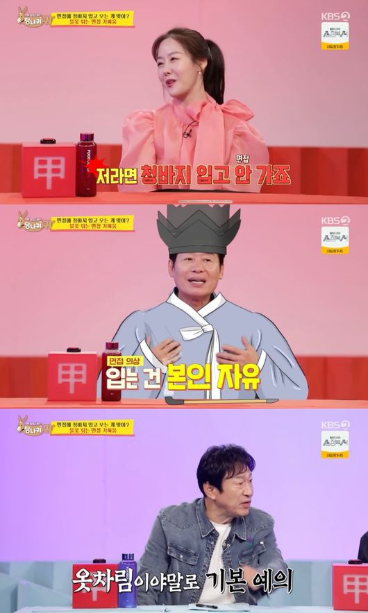 이때 한 지원자는 청바지를 입고 등장, “면접에 청바지 입고 온 걸 처음 봤다”라며 성 대표의 지적을 들었다. 이를 지켜보던 김숙은 “청바지면 괜찮지 않나”라며 의아해했고, 성 대표는 “입어도 안 되는 건 아닌데, 저라면 청바지 입고 안 간다”라며 소신을 전했다.