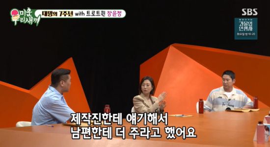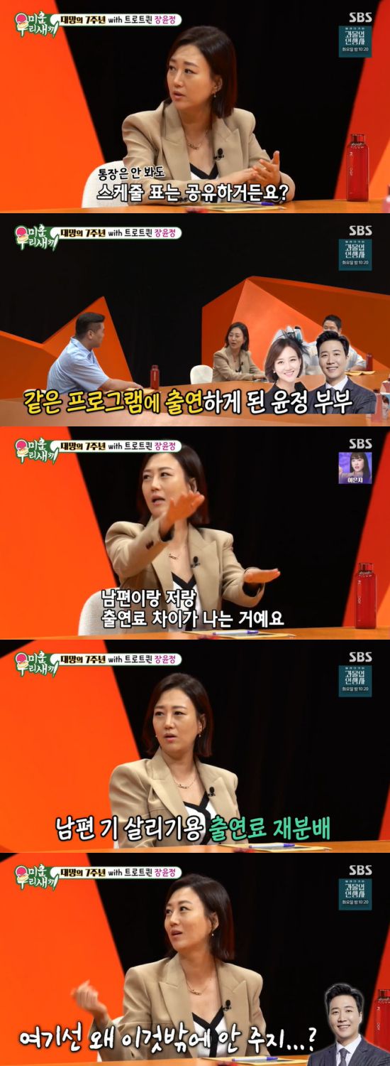 장윤정은 "(도경완과) 같이 방송하는 게 있었다. 연예인들 출연료라는 게 대충 있지 않냐. 부부인데 저하고 출연료가 차이가 나는 거다. 눈치 보이는 것도 아니고 마음이 불편하다. 저는 제작진한테 이야기해서 (도경완) 저쪽으로 더 주라고 한다. 그렇게 했더니 부작용이 다른 프로그램에 가서 '왜 나 이것밖에 안 주지?' 하는 거다"라며 폭로했다.