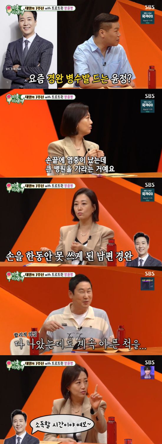 서장훈은 "도경완 씨 병수발을 들고 있다는 게 무슨 이야기냐"라며 궁금해했고, 장윤정은 "굉장히 단순하게 손끝에 염증이 나서 병원에 갔는데 큰 병원을 가라고 하시더라. 거의 조직을 다 뜯어냈다. 수술을 마쳤는데 감염이 된 거다. 손을 못 쓰니까 생활이 너무 어려운 거다. 아무것도 못하게 되더라"라며 설명했다.