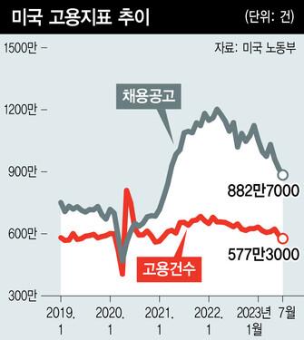 최근 미국 노동부가 집계·발표한 구인·이직 보고서(JOLTs)에 따르면 7월 채용공고는 882만건으로 전달보다 33만8천건 감소했다. 이번 수치는 지난 2021년 3월 이후 가장 적은 수준일 뿐만 아니라 월가의 예상치인 950만건을 크게 밑돈다. 기업들의 채용공고가 이처럼 감소한 것은 경기 둔화 우려로 기업들이 인력 채용에 신중한 태도를 보였기 때문이다.