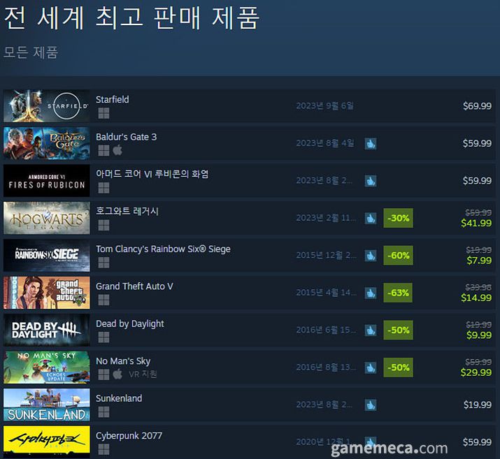 사전 플레이로 주목 받은 스타필드가 전 세계 최고 판매 1위를 5일째 유지 중인 가운데, 또 다른 SF 어드벤처 노 맨즈 스카이가 순위권에 모습을 보였다. 리뷰에서는 스타필드를 접하고 실망한 유저들에게 더 좋은 평가를 받고 있다.