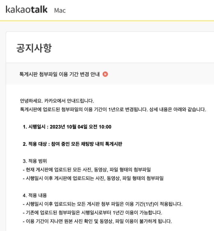 4일 카카오는 자사 홈페이지에 공지사항을 올리고 내달 4일부터 톡게시판에 업로드된 첨부파일의 이용 기간을 1년으로 변경한다고 밝혔다.