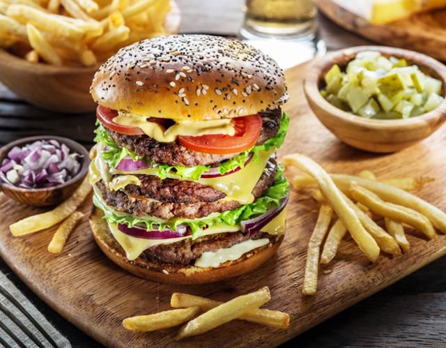 햄버거와 감자튀김, 코울슬로가 나무 플레이트 위에 놓여 있다. 게티이미지뱅크