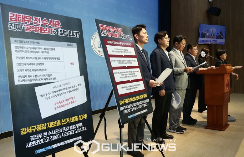 (서울=국제뉴스) 더불어민주당 검찰독재정치탄압대책위원회 위원들이 5일 서울 여의도 국회 소통관에서 김태우 전 수사관 관련 기자회견을 하고 있다. /사진=원명국 기자