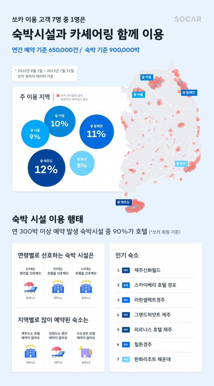 쏘카는 지난해 8월~올해 7월 1년간 쏘카 정차지 데이터를 분석한 결과 약 15%가 제주·강원에서 공유차량과 숙박시설을 동시 이용했다고 6일 밝혔다. 7명 중 1명은 차를 빌리면서 숙박도 이용하는 셈이다. 지난 1년간 숙박시설 예약건수는 65만건, 투숙일은 90만박을 기록했다.