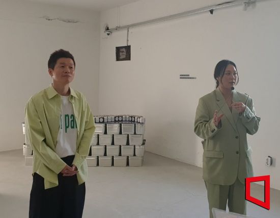 구재회 코오롱인더스트리FnC부문(코오롱FnC) 액세서리(ACC) 사업부 상무(왼쪽)와 임세희 쿠론 브랜드매니저가 6일 서울 성동구 키르스튜디오에서 열린 2023 가을·겨울(FW) 시즌 프레젠테이션에서 리브랜딩을 추진한 배경과 결과에 대해 설명하고 있다. |