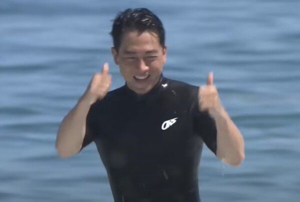 지난 3일 일본 후쿠시마현 바다를 찾은 고이즈미 신지로 전 환경상. 일본 매체 FNN 유튜브 채널 갈무리 |