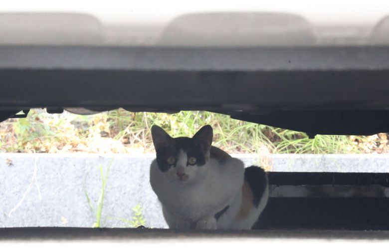 자동차 아래 그늘에 들어가 더위를 피하고 있는 길고양이. /뉴스1