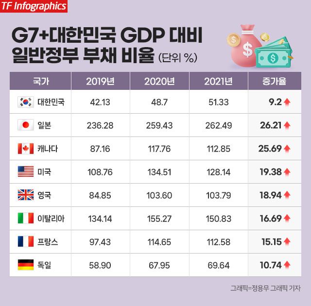 세계 7대 주요 선진국(G7)은 우리나라보다 국가 채무 비율 상승폭이 더 컸다. △일본은 2019년 236.28%에서 2021년 262.49%로 '26.21%P↑' △캐나다는 2019년 87.16%에서 2021년 112.85%로 '25.69%P↑' △미국은 2019년 108.76%에서 2021년 128.14로 '19.38%P↑' △영국은 2019년 84.85%에서 2021년 103.79로 '18.94%P↑' △이탈리아는 2019년 134.14%에서 2021년 150.83%로 '16.69%P↑' △프랑스는 2019년 97.43% 2021년 112.58로 '15.15%P↑' △독일은 2019년 58.90%에서 2021년 69.64%로 '10.74%P↑' 국가 채무 비율이 늘었다.