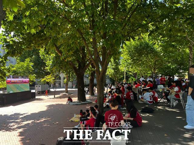 8일 '정기 고연전(연고전)'이 시작됐다. 사진은 고려대 민주광장에서 야구 경기를 관람하고 있는 학생들 /조소현 기자 |