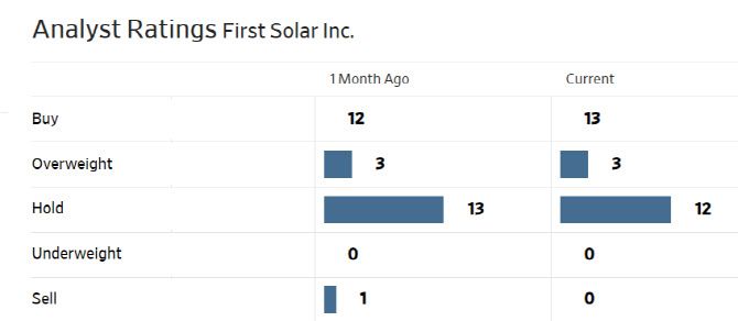 한편 월가에서 퍼스트솔라에 대해 투자의견을 제시한 애널리스트는 총 28명으로 이 중 16명(57%)이 매수(비중확대 및 시장수익률 상회 등 포함) 의견을 유지하고 있다. 평균 목표주가는 250달러로 이날 종가보다 36.4% 높다.