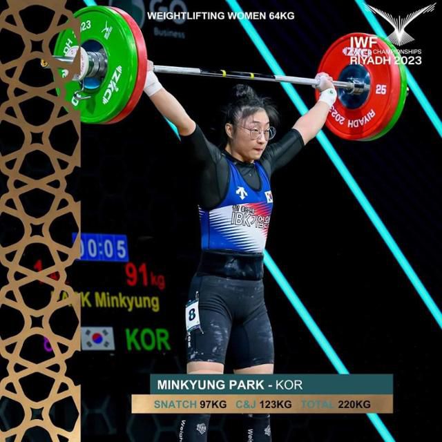 박민경은 10일(현지시간) 사우디아라비아 리야드에서 열린 대회 여자 64㎏급 경기에서 인상 97㎏, 용상 123㎏, 합계 220㎏을 들었다. 인상에서는 6위에 그쳤지만 용상에서 1위를 하며 가장 중요한 합계에서 동메달을 목에 걸었다.