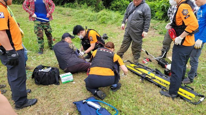 지난 10일 벌초객이 부상을 입고 소방대원에게 치료를 받고 있다.[자료=제주소방] |