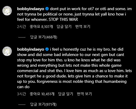 아이콘(iKON) 바비(BOBBY)가 전 멤버 비아이(B.I, 본명 김한빈)를 두고 대립하는 팬들의 갈등을 중재했다.