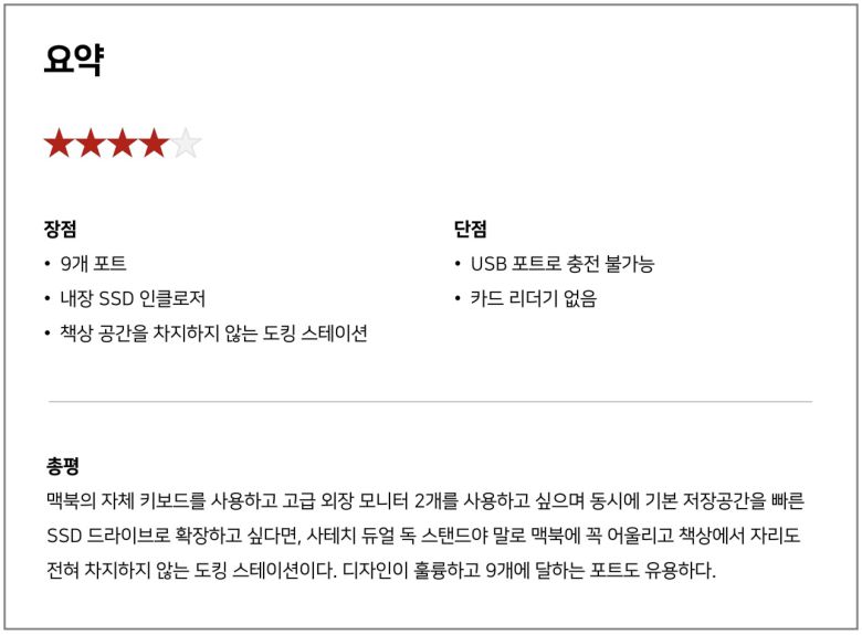 사테치 듀얼 독 스탠드는 맥북의 자체 키보드를 사용하면서 최대 2대까지 외장 디스플레이를 연결하기 원하고 기본 저장 용량을 빠른 SSD 드라이브로 늘려야 하는 사용자에게 적합한 제품이다. 9개 유용한 포트를 제공하면서도 책장 공간을 전혀 차지 않는 깔끔한 도킹 스테이션이기도 하다.editor@itworld.co.kr