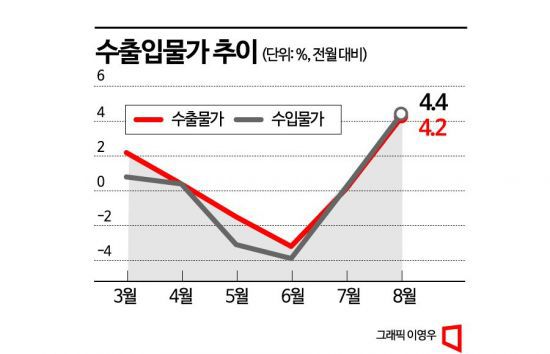 유 팀장은 "8월 수출물가는 원·달러 환율이 상승한 가운데 석탄·석유제품, 화학제품 등이 오르며 전월보다 큰 폭으로 상승했다"고 설명했다.