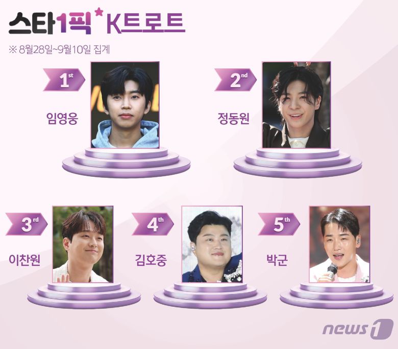 이번에서 스타1픽 트로트 부문 1위는 임영웅이었다. 최근 2주간 집계한 트로트 순위에서 임영웅은 정상에 오르며, 트로트계 히어로다운 모습을 또 한 번 보여줬다. 지난 2020년 TV조선(TV CHOSUN) '내일은 미스터트롯'에서 진(1위)를 차지하며 큰 사랑을 받은 임영웅은 호소력 짙은 보이스와 준수한 비주얼로 트로트 팬심을 흔들고 있다. 특히 큰 키와 훤칠한 이목구비로 전 연령대 여성들의 마음을 사로잡으며 독보적인 인기를 과시하는 중이다. 임영웅은 오는 10월부터 전국 투어 '아임 히어로 투어 2023'(IM HERO TOUR 2023)를 개최한다. 서울 올림픽공원 KSPO 돔(체조경기장)에서 화려하게 포문을 여는 임영웅의 전국투어 콘서트는 이후 대구와 부산, 대전, 광주에서 그 열기를 잇는다.
