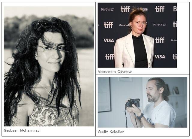 <제3회 힌츠페터 국제보도상 대상>- 2022년 러시아-우크라이나 전쟁 발발 후 러시아 내부 이야기를 취재한 <인사이드 러시아: 푸틴의 국내 전쟁>이 ‘기로에선 세계상(최우수작)’ 수상작으로 선정됐다. 수상자 (왼쪽부터 시계방향) 게스빈 모하마드(Gesbeen Mohammad, 영국 거주, 국적 비공개), 알렉산드라 오디노바(Aleksandra Odynova, 러시아), 바실리 콜로틸로프(Vasily Kolotilov, 러시아). 유리 미하일로비치(Yuri Mikhailovich, 가명)는 취재원 보호로 실명·얼굴을 비공개했다.